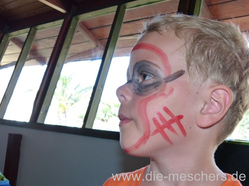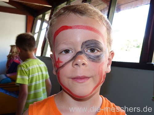 Simon hat auch einen Tag den Miniclub besucht. Der hat ihm aber nicht so gut gefallen, da er vor allem von polnischen Kindern dominiert wurde. Die Betreuer konnten auch nur polnisch und englisch, so dass er da nicht allein hin konnte. Die Piratenschatzsuche hat ihm allerdings großen Spaß gemacht und auch die passende Bemalung durfte da nicht fehlen.